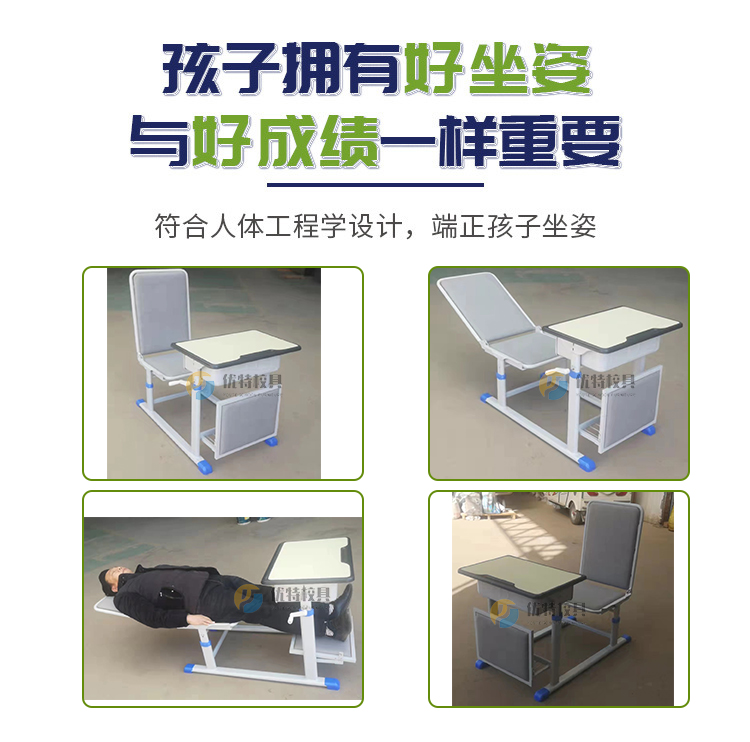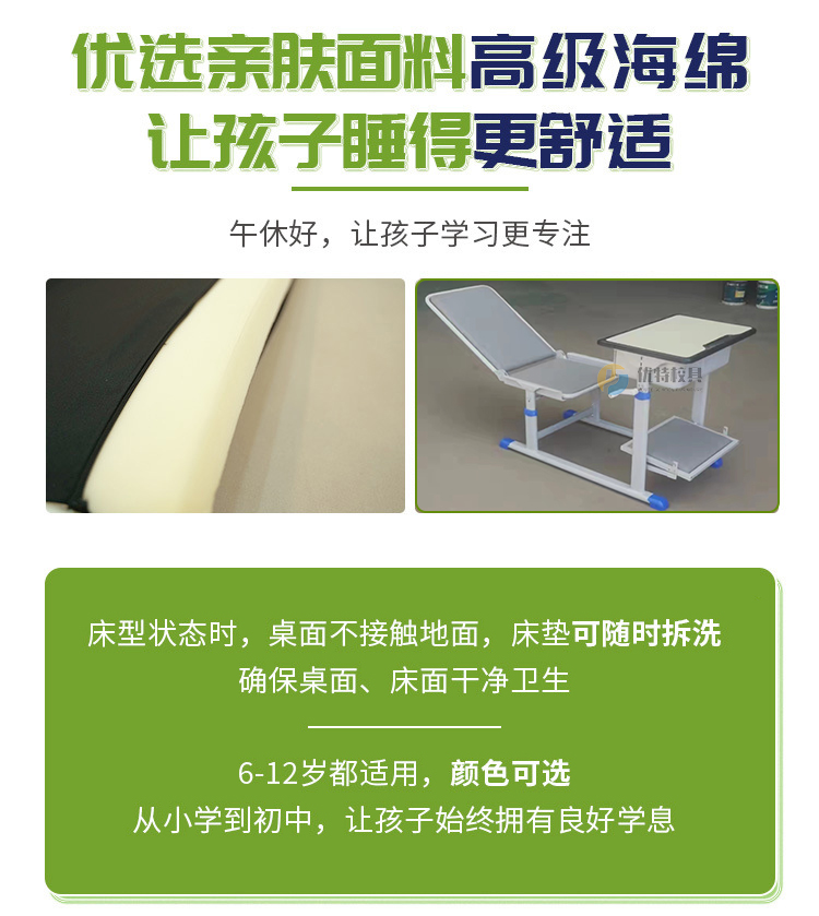 折疊午休課桌椅滿足日常學(xué)生學(xué)習(xí)書寫的使用功能,同時(shí)可以作為學(xué)生午休時(shí)的寢具使用,既符合人體工程學(xué)設(shè)計(jì)端正孩子坐姿,同時(shí)也滿足孩子午休需要,午休課桌椅的使用既節(jié)省了空間同時(shí)又為學(xué)生提供便利,可以滿足6-12歲學(xué)生的日常使用需要,可滿足小學(xué)、初中學(xué)生不同身高使用需求,同時(shí)加設(shè)海綿墊使用感更舒適。床型狀態(tài)時(shí),桌面不接觸地面,床墊可隨時(shí)拆洗,確保桌面和床面干凈衛(wèi)生。同時(shí)平鋪和收納操作簡單單人獨(dú)立即可完成收合、打開步驟,讓孩子可以更好的學(xué)習(xí)和休息。